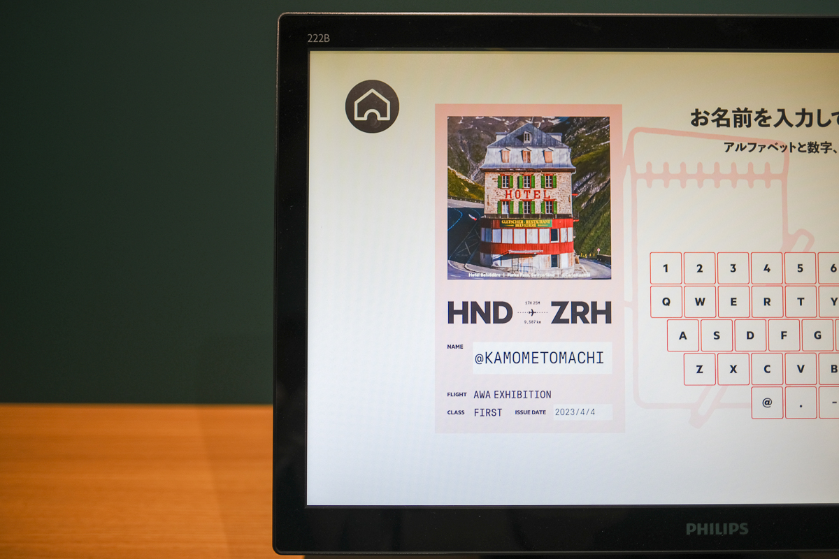ラストの仕掛けがおもしろい!セルフチェックインカウンターで、気になる旅先を選び、名前やメールアドレスを入力すると……。