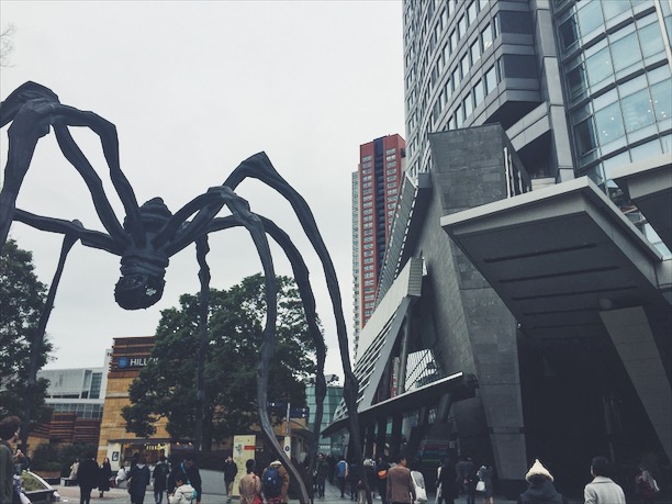 - 右手に大きなツリーと左手にクモのオブジェを見ながらまっすぐ進みます